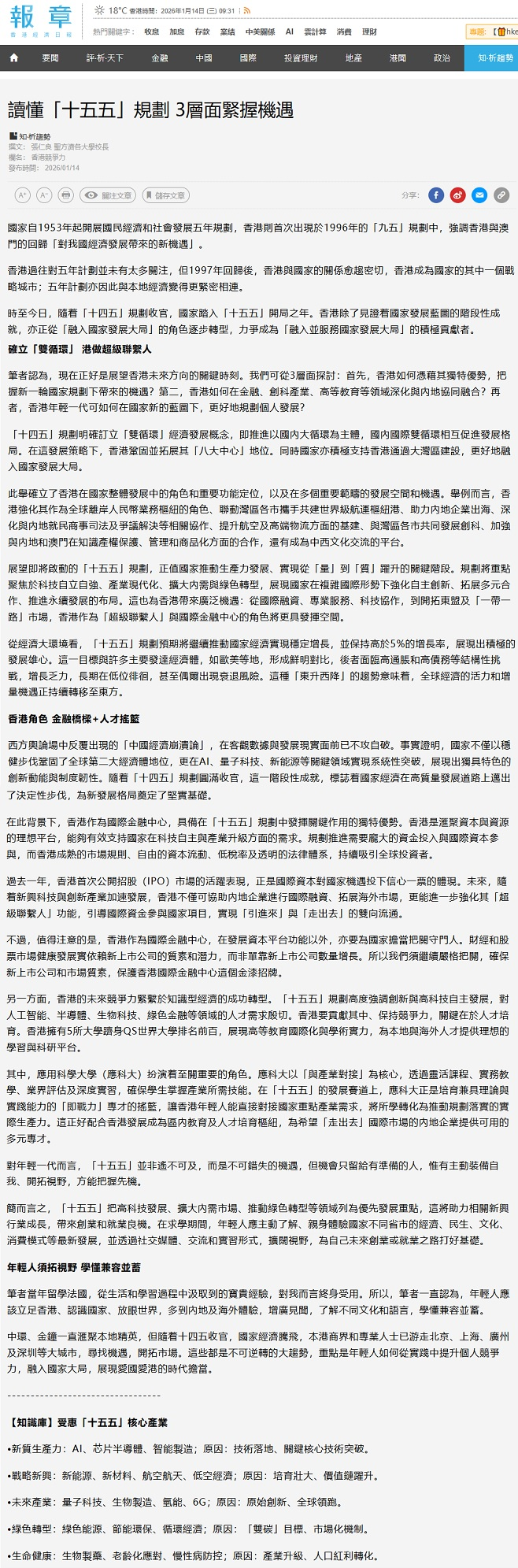 President Professor Stephen Cheung Yan-leung has contributed an op-ed to HKET on 14th January 2026. The article analyses the enormous opportunities presented by the National 15-5 Plan, with highlights on the role of UAS in nurturing talents and take-home messages for the youth. You may click on the link to read the op-ed online -