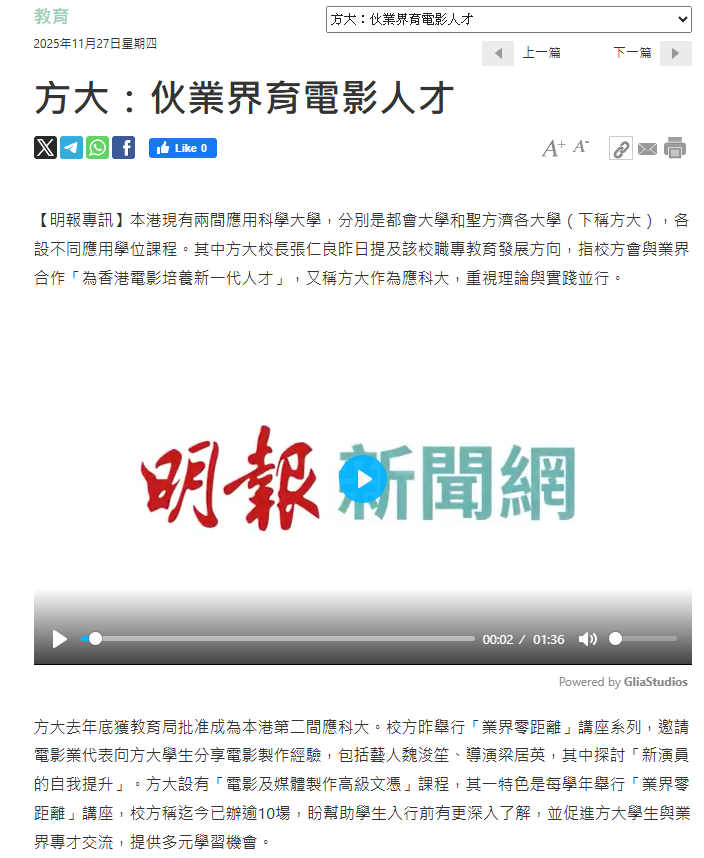 方大校长张仁良教授表示:「作为应用科学大学,方大一直重视理论与实践并行,与业界携手合作,为香港电影培养新一代人才。」以下为相关传媒报道: