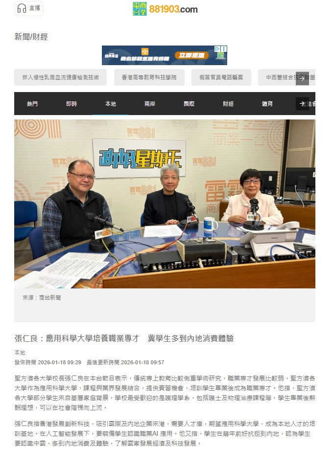 圣方济各大学(方大)校长张仁良教授昨日(18日)出席商业电台节目《政好星期天》,接受主持陈淑薇及罗辉访问,重点分享应用科学大学(应科大)在香港高等教育体系中的定位、发展与潜力。