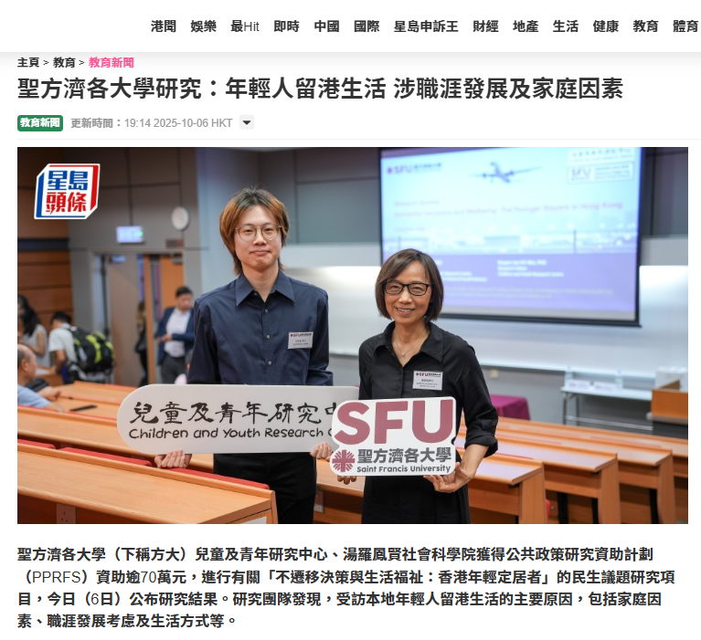 星岛头条网:圣方济各大学研究:年轻人留港生活 涉职涯发展及家庭因素