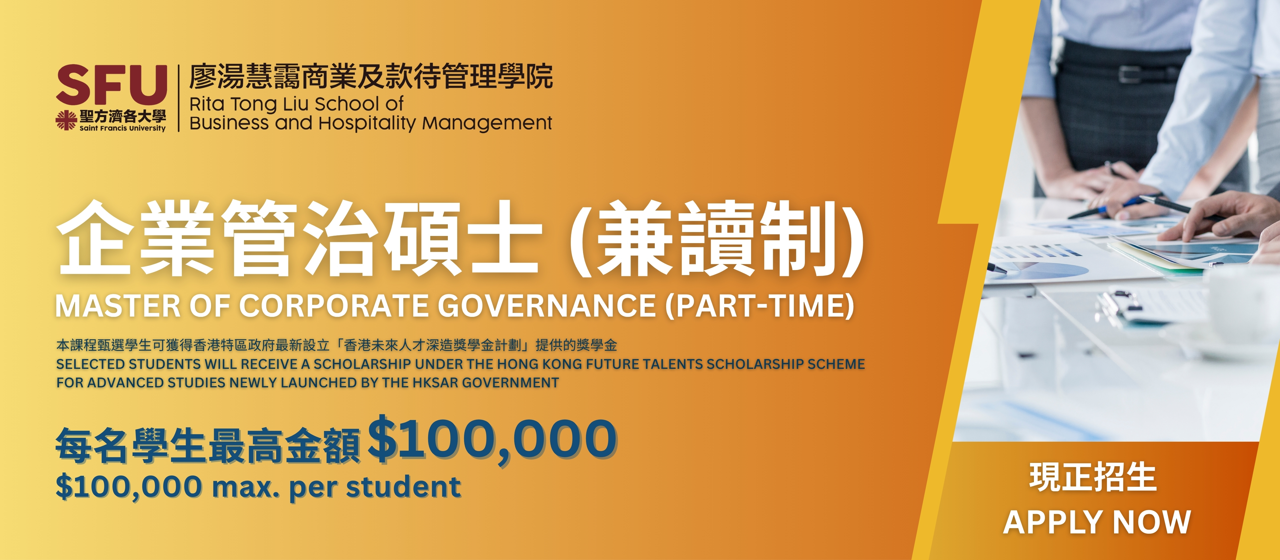 廖湯慧靄商業及款待管理學院開辦的企業管治碩士課程獲得「香港未來人才深造獎學金計劃」支持,從2025/26學年開始,經甄選的新生可獲得獎學金。