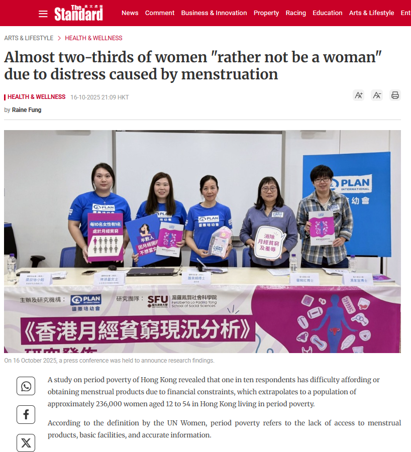 Saint Francis University (SFU) collaborated with Plan International to conduct the first large scale study on period poverty in Hong Kong. Between June and August, 1,000 Hong Kong women aged 12 to 54 were randomly selected for telephone interviews. Seven focus group discussions were held from August to September. The findings reveal that one in ten respondents struggles to afford menstrual products due to financial constraints, with an estimated 236,000 women aged 12 to 54 affected across Hong Kong.