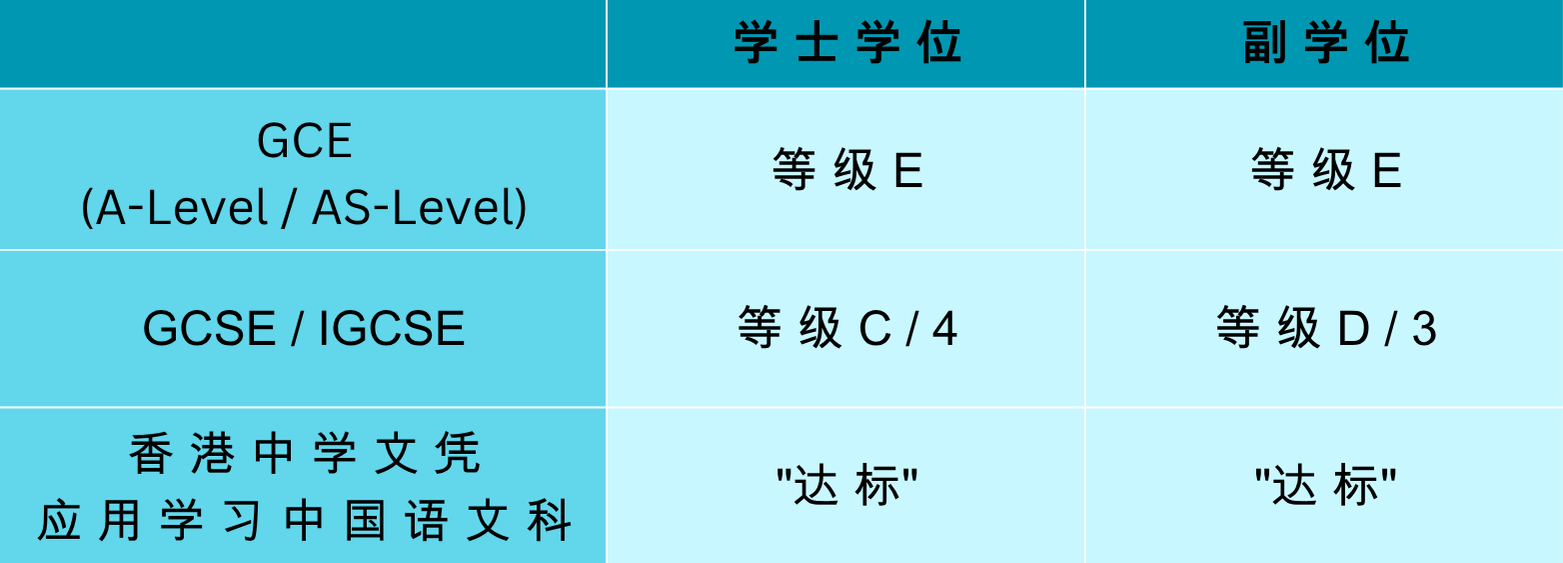非华语申请人如符合以下其中一种特定情况,本校会接纳以下考试成绩为符合申请学士学位及副学位的中文能力要求。