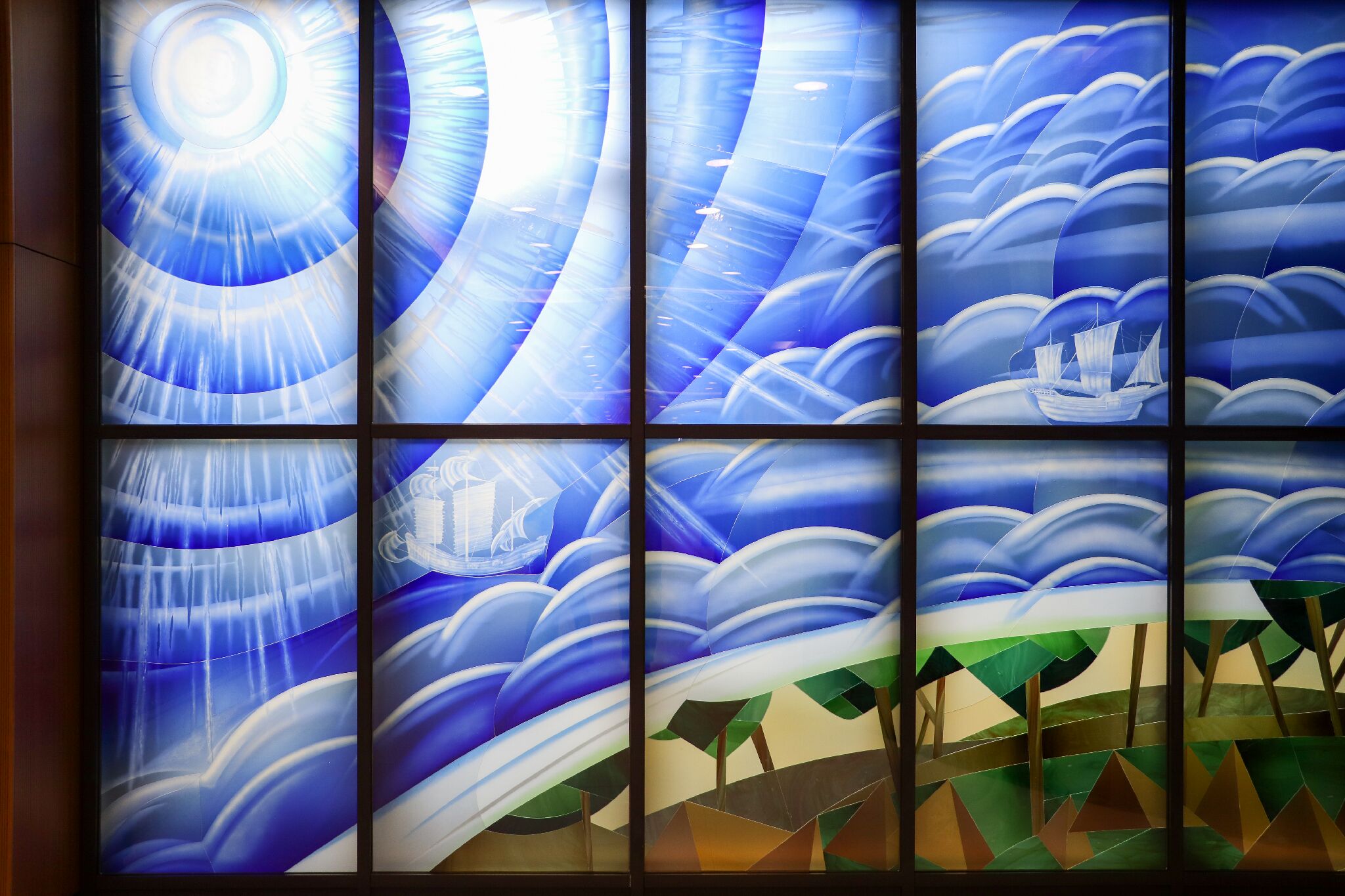 圣堂外彩绘玻璃两艘船于大海上行驶,记述圣方济沙勿略 到日本及中国(卒于上川岛)传教,带出福传精神。