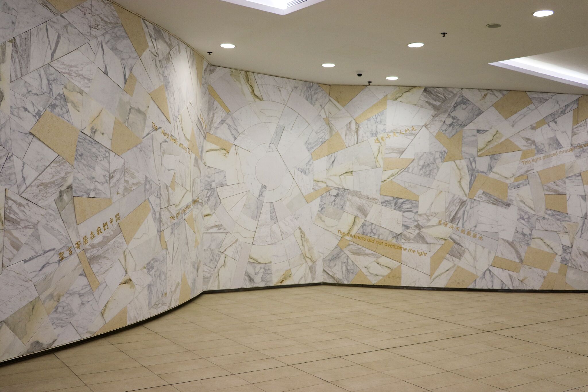 演讲厅外的简约马赛克壁画,圆心辐射出圣言隽语,代表圣方济沙雷氏 传播学问及信仰。