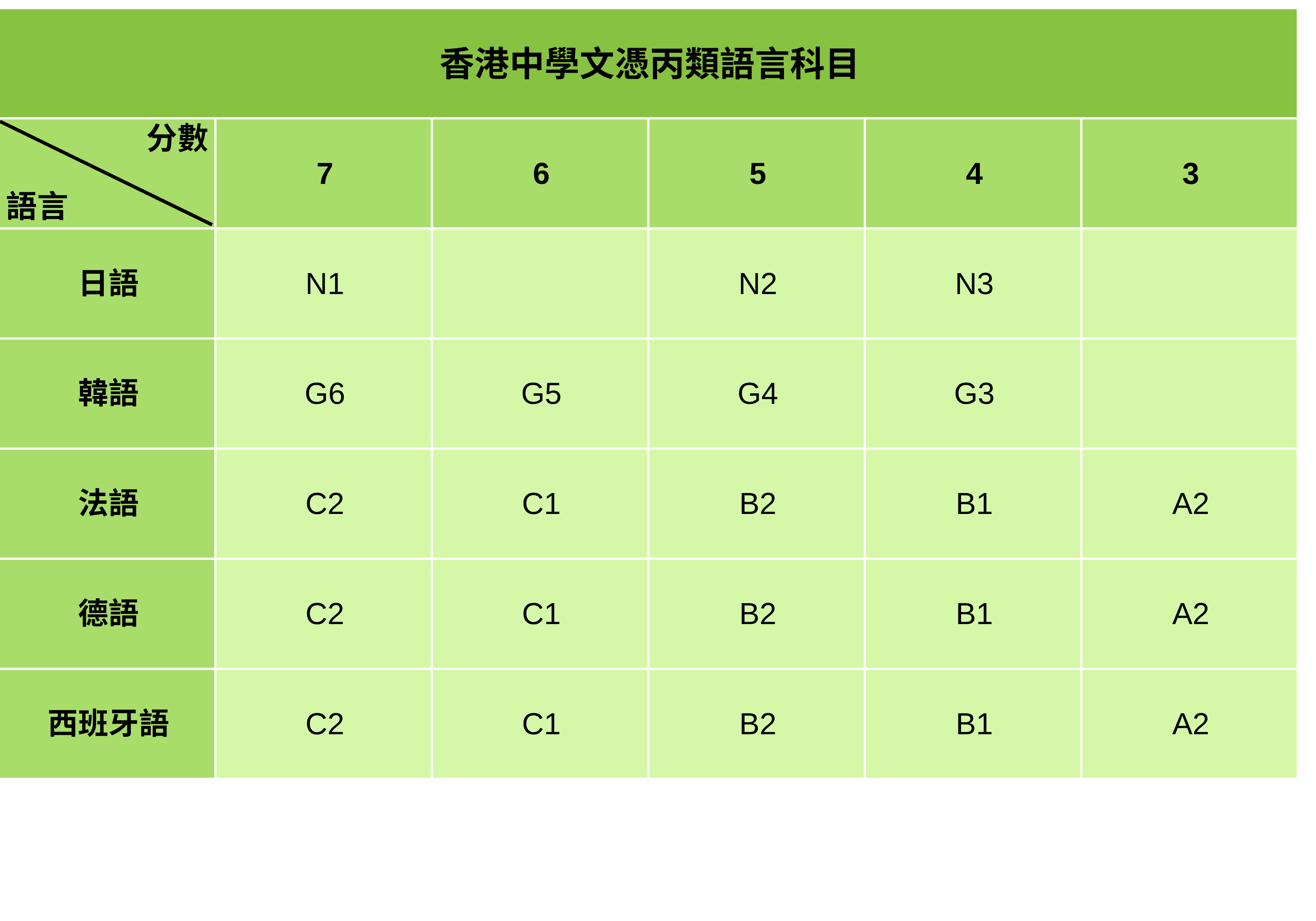 - 除課程有特別指定之入學要求,最多一科其他語言科目成績(丙類)被視爲選修科目。科目級別之分數轉換請參考以下列表。