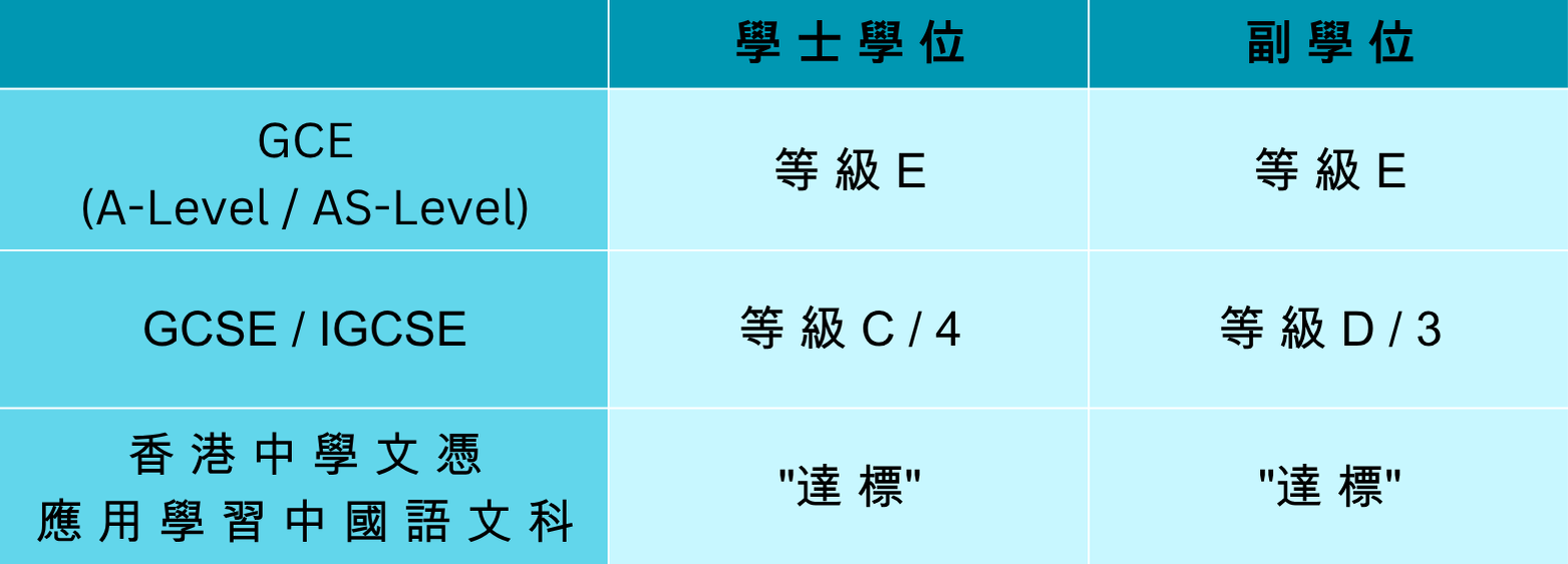 非華語申請人如符合以下其中一種特定情況,本校會接納以下考試成績為符合申請學士學位及副學位的中文能力要求。