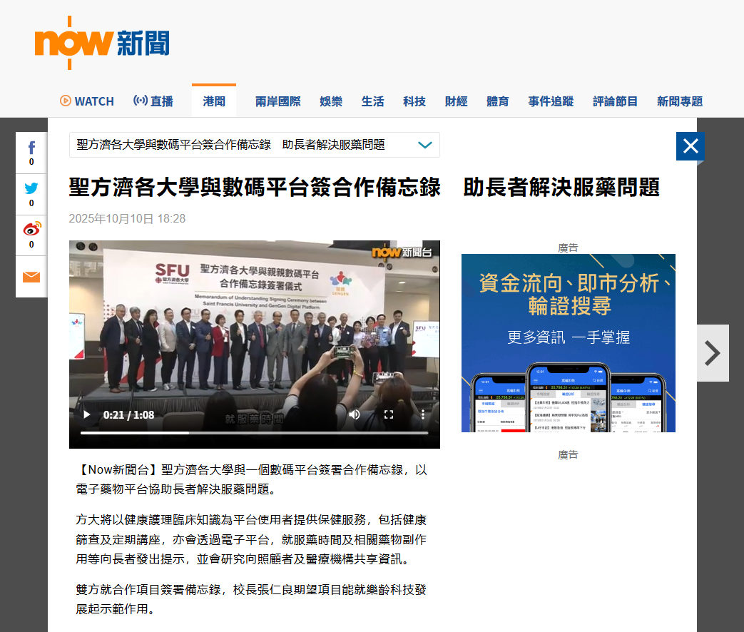 Now新聞:聖方濟各大學與數碼平台簽合作備忘錄 助長者解決服藥問題