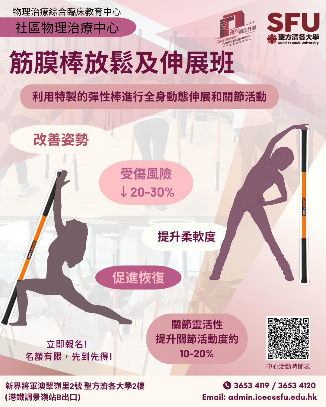 學習伸展上下肢軀幹的技巧,加入mobility stick元素,放鬆筋膜和緩解痛症。適合所有年齡和體能水平的人士 。